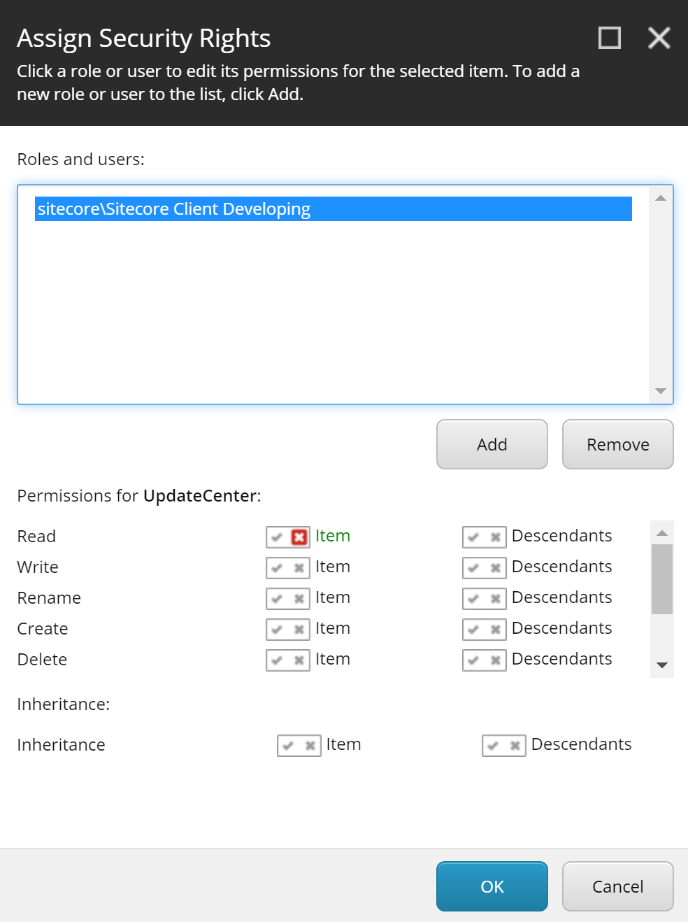 Click on UpdateCenter to load the item’s information in the main content pane of the Content Editor. In the ribbon, select the Security Tab and then click on the Assign button.
