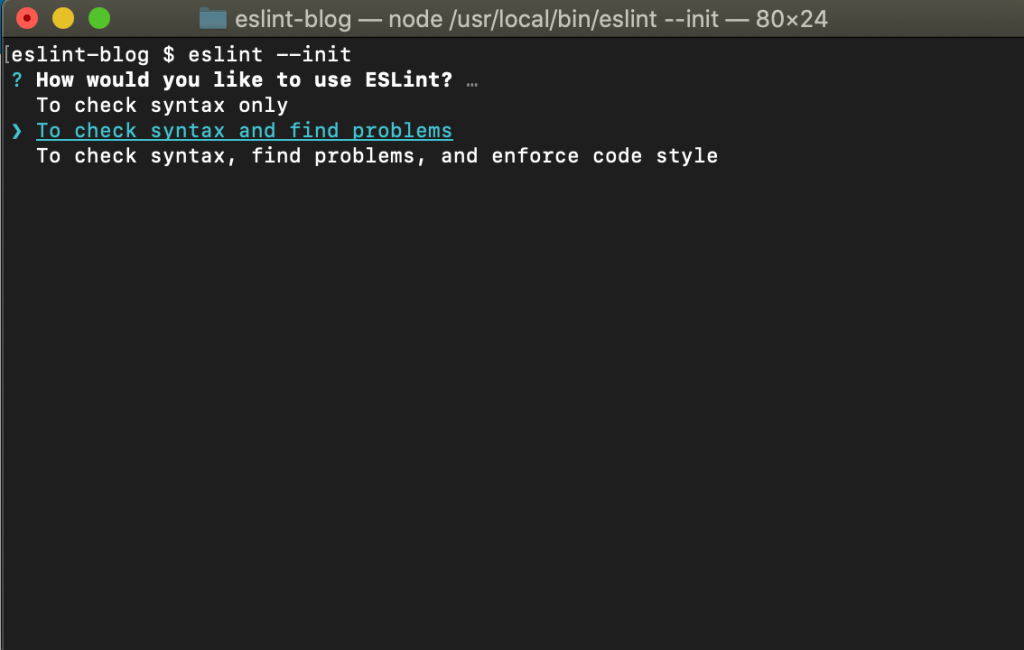 During the initialization and configuration process you’ll be asked a series of questions. The first of which configures how strict you want ESLint to be with the default set to checking syntax and finding problems (as shown above).